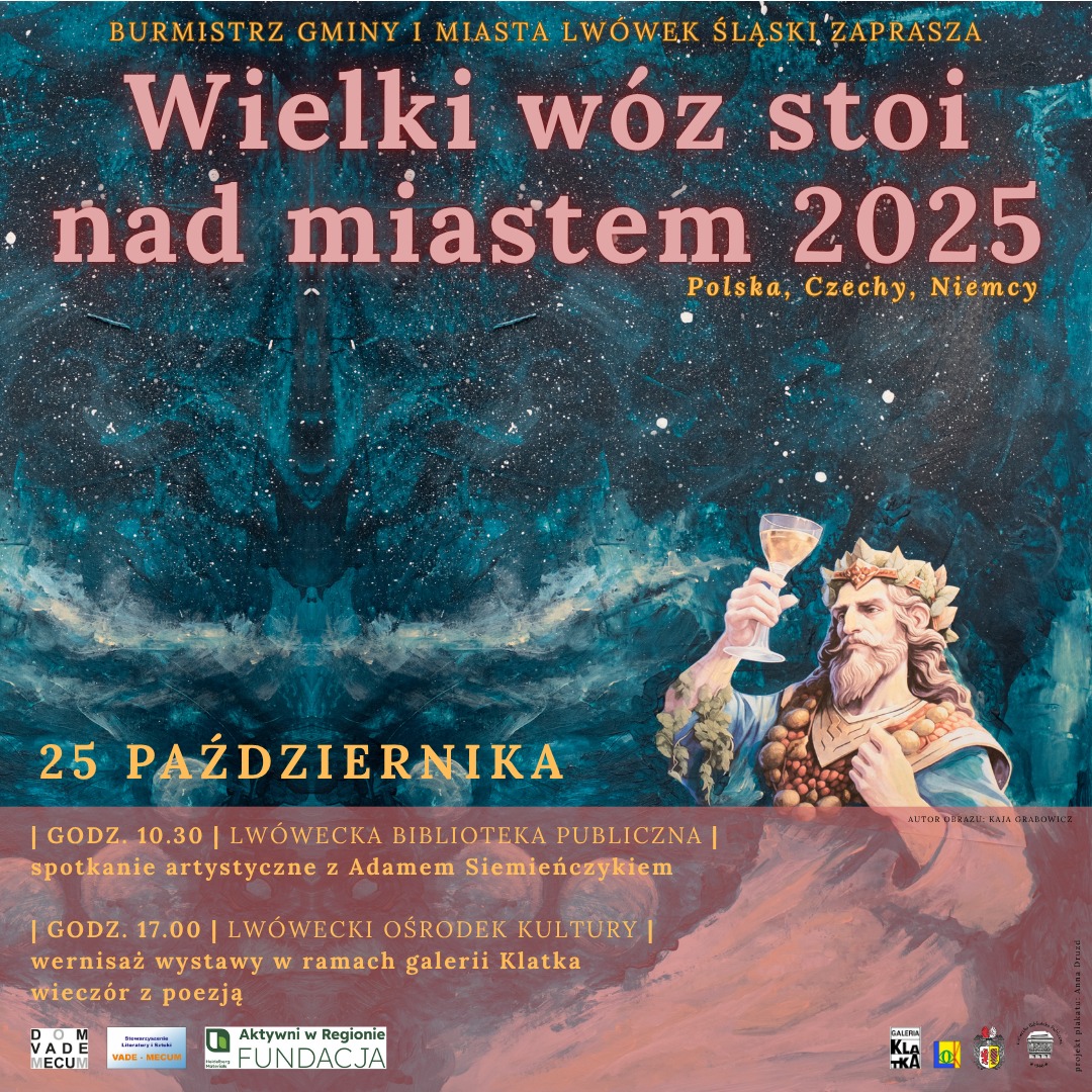 Zapraszamy na spotkanie poezji ze sztuką pod hasłem "Wielki wóz stoi nad miastem 2025". W sobotę 25 października o godz. 10.30 w Lwóweckiej Bibliotece Publicznej odbędzie się spotkanie artystyczne, które poprowadzi Adam Siemieńczyk, zaś o godzinie 17.00 odbędzie się wernisaż wystawy prac artystów: Kai Grabowicz, Krystyny Skwarkowskiej, Elżbiety Suchcickiej oraz Władysława Gałczńskiego. Po wstępie dla oka, odbędzie się uczta dla ucha! Pieśni i poezję zaprezentują goście: Adam Siemieńczyk, Milan Hrabal, Josef Straka, Róza Damascyna, Dieter Kalka, Nina Malinowska - Dziewięcka, Dariusz Dziewięcki, Anna Janko, Urszula Benka, Agnieszka Garbiec, Wojciech Izaak Strugała, Magdalena Dąbrowska, Peter Gehrisch.