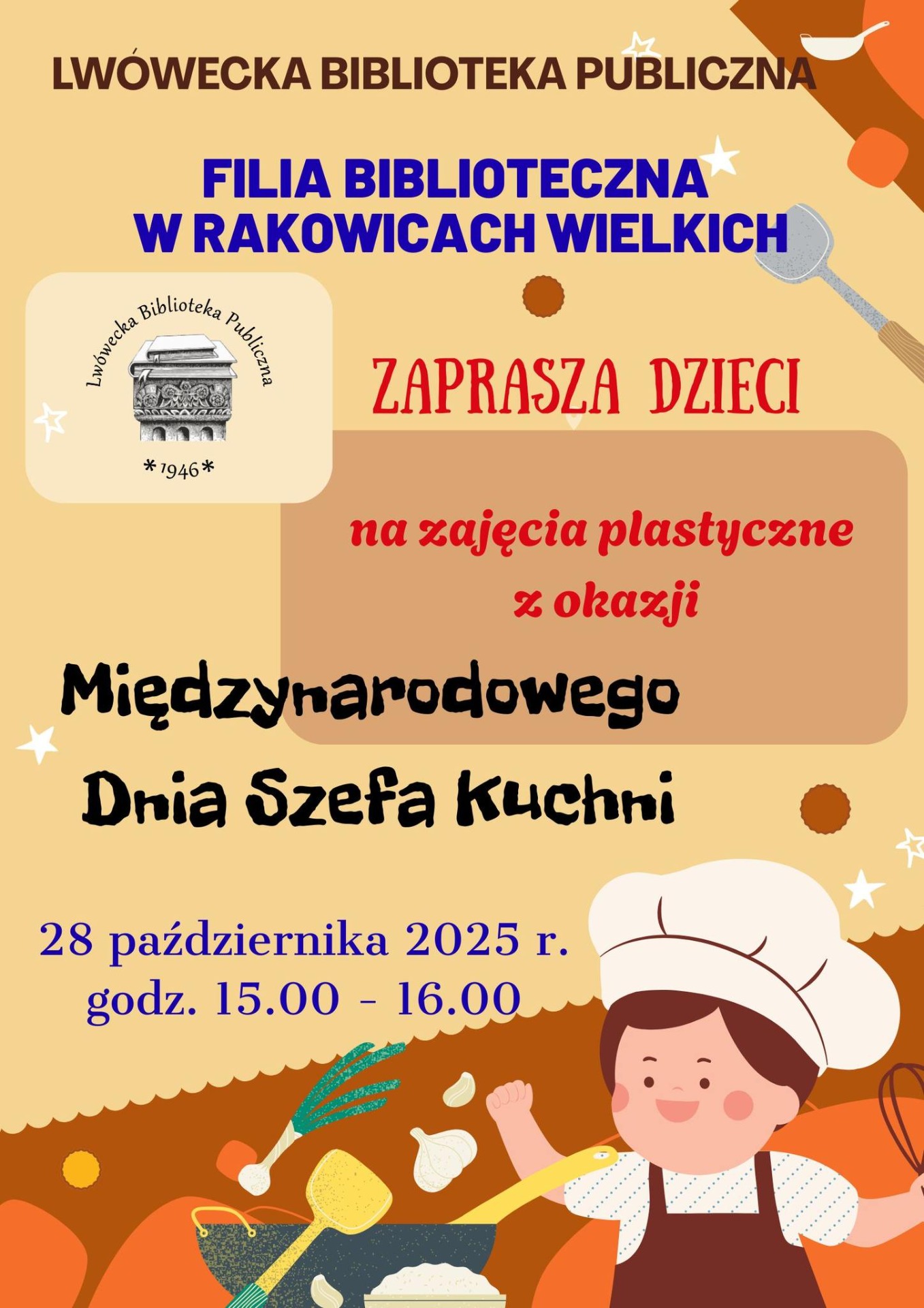 Z okazji Międzynarodowego Dnia Szefa Kuchni filia biblioteczna w Rakowicach Wielkich zaprasza dzieci na zajęcia plastyczne, które odbędą się 28 października 2025 r. w godz. od 15.00 do 16.00. Filia biblioteczna w Sobocie zaprasza dzieci na podobne zajęcia plastyczne 30 października 2025 r. w godz. od 15.30 do 16.30. Ponadto wyjątkowe popołudnie z planszówkami odbędzie się 29 października w godz. od 16.30 do 17.30 w filii bibliotecznej w Niwnicach.