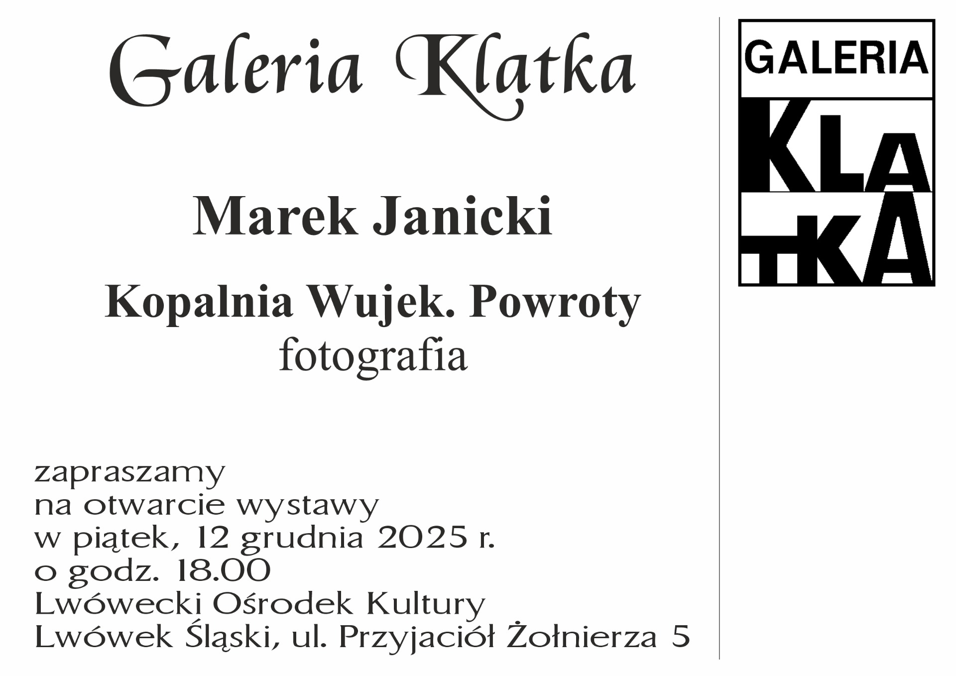 Zapraszamy na otwarcie wystawy fotografii Marka Janickiego "Kopalnia Wujek. Powroty". Galeria Klatka, piątek 12 grudnia 2025 r., godz. 18.00. Organizatorem wydarzenia jest Lwówecki Ośrodek Kultury, ul. Przyjaciół Żołnierza 5.