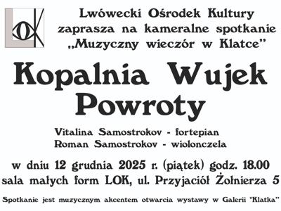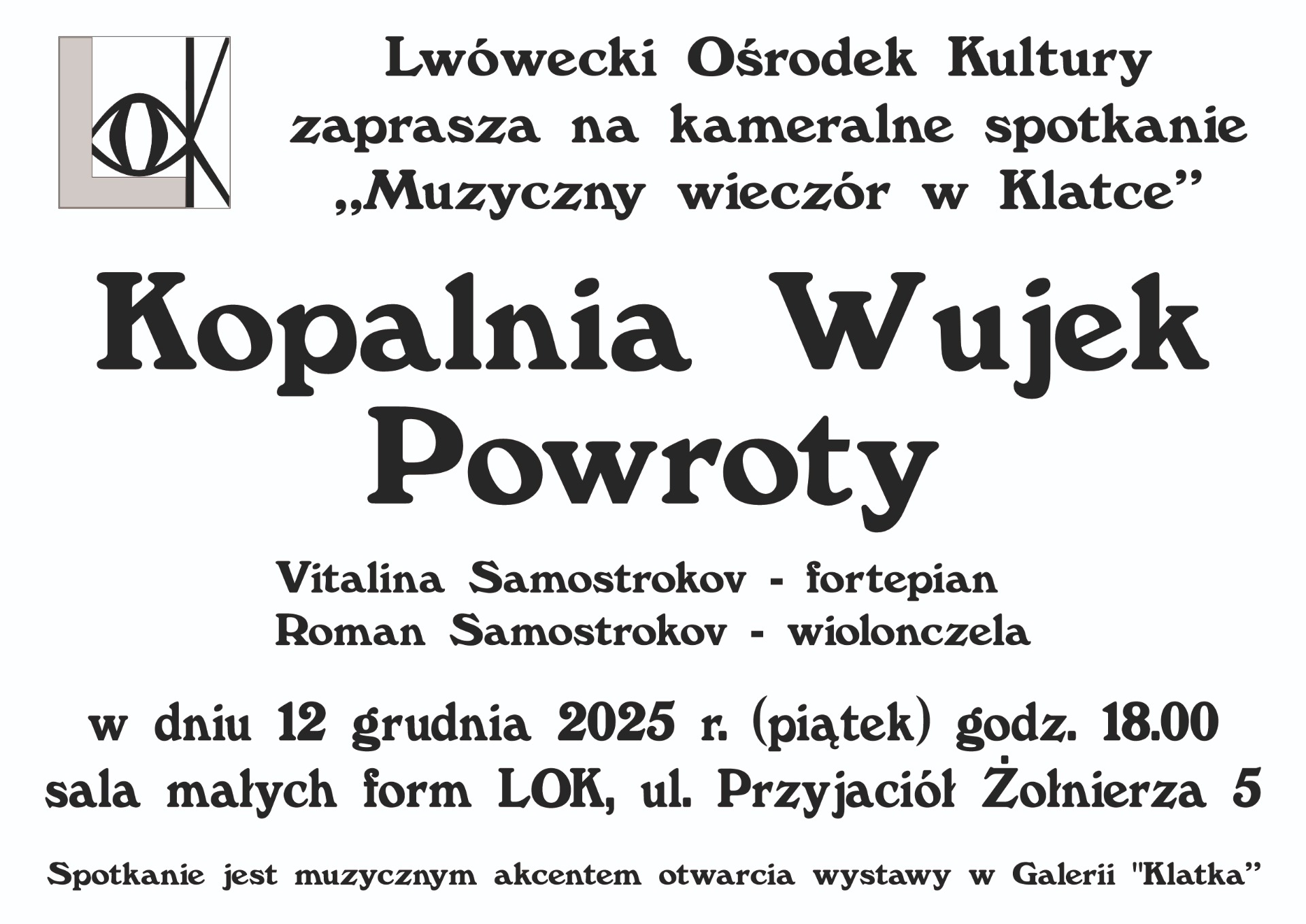 Zapraszamy również na kameralne spotkanie „Muzyczny wieczór w klatce". Wystąpią: Vitalina Samostrokov - fortepian oraz Roman Samostrokov - wiolonczela.