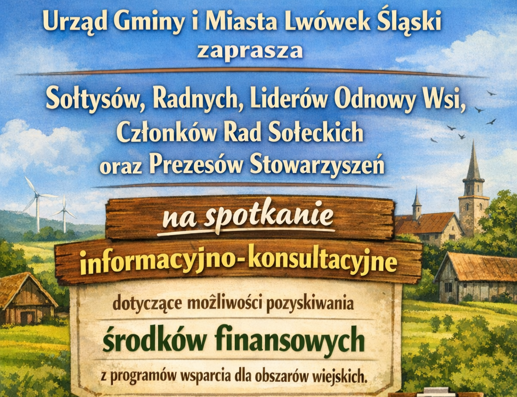 Urząd Gminy i Miasta Lwówek Śląski zaprasza Sołtysów, Radnych, Liderów Odnowy Wsi, Członków Rad Sołeckich oraz Prezesów Stowarzyszeń na spotkanie informacyjno-konsultacyjne dotyczące możliwości pozyskiwania środków finansowych z programów wsparcia dla obszarów wiejskich. Spotkanie odbędzie się dnia 08 stycznia 2026 r. (czwartek) o godzinie 1200 w Urzędzie Gminy i Miasta w Lwówku Śląskim, Duża Sala konferencyjna, Al. Wojska Polskiego 25 A.