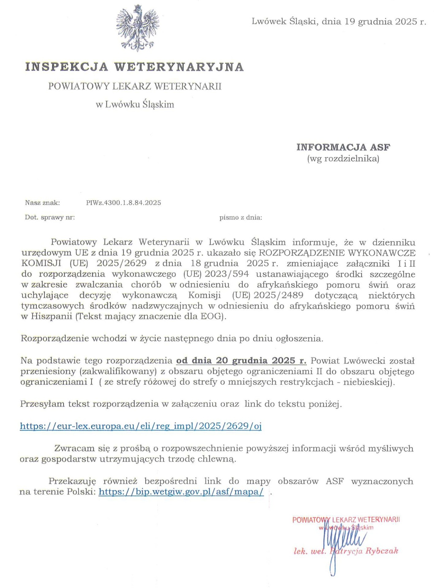 Informacja Powiatowego Lekarza Weterynarii w Lwówku Śląskim z dnia 19 grudnia 2025r. w sprawie ASF